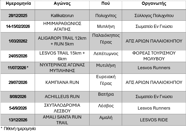 Το καλενταρι λειτουργεί ενημερωτικά και ο σύλλογος Lesvos Runners δεν ευθύνεται σε τυχόν αλλαγές ή ακυρώσεις αγώνων που δεν διοργανώνει ο ίδιος