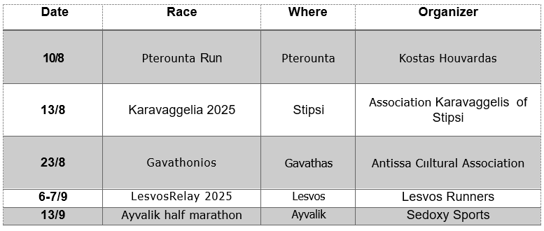 The calendar just provides information and Lesvos Runners club is not responsible for any race changes or cancellations from the organizers